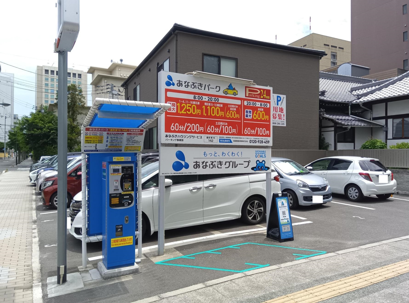 (平日)昼間:(8:00~20:00)最大1,250円 ※⑤~⑩区画のみ最大1,100円 (全日)夜間:(20:00~8:00)最大600円 (土日祝)昼間:(8:00~20:00)最大600円 |